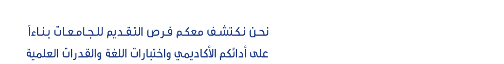 التصنيف الأكاديمي، طبيعة الدراسة، البيئة العامة، الموقع الجغرافي، تكاليف المعيشة هي بعض اهم العوامل التى يجب ان تبنون عليها اتخاذكم لاي قرار يتعلق بالدراسة بالخارج. نحن ايضاً نكتشف معكم فرص التقديم للجامعات من (قبول مشروط او قبول نهائي) بناءاً على أدائكم الأكاديمي الحالي بالأضافة إلى اختبارات اللغة (التوفل او الآيليتس) والقدرات العلمية (الجيمات او الجي ار اي).